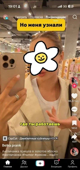 Зашла, кстати, посмотреть профиль блогера и поняла, что там далеко не одно такое видео. Подходит и к девушкам-консультантам, “знакомя” их с покупателями, и не только к работникам “Золотого яблока” - например, есть видео из магазина одежды. Потом намеренно провоцирует человека фразой “Кто шевельнется, тот г@й”. Всё строится на провокации, и чем больше люди не реагируют, тем наглее и настырнее становятся каждое следующее видео. Так хотелось в моменте, чтоб он на какого-нибудь качка-кавказца напоролся…