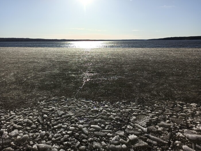 А потом ледяная корка становится настолько хрупкой, что ломается из-за движения воды на уже растаявших участках, превращается в приятную шелестящую кашу. Издалека кажется, что это монолитная масса, а вблизи видно, что здесь миллионы кусочков льда. Это называется Шуга. Блестит на солнце как хрусталь и постоянно шепчет. Особенно ночью, когда наступает тишина, шуга шевелится на поверхности воды, шуршит и словно рассказывает сказки. Поскольку у меня дом на берегу водоема, я люблю открывать окно и слушать эти звуки. Вот и сейчас до меня доносится легкий шепот - шугу прибило к моему берегу из-за сильного ветра.