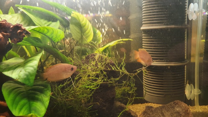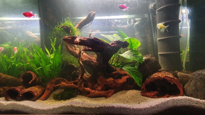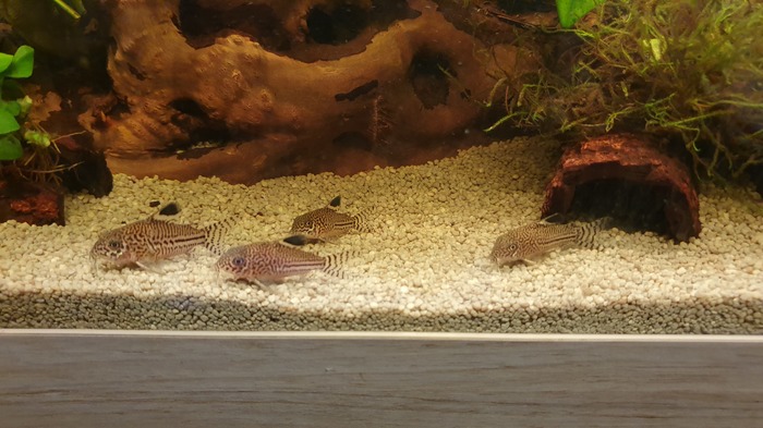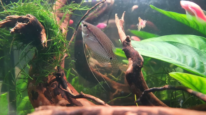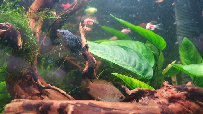 Плавают 6 гурами (медовые, мраморные, жемчужные) , 4 сома коридораса, несколько тернеций и 1 красавец анциструс растёт и крепнет.