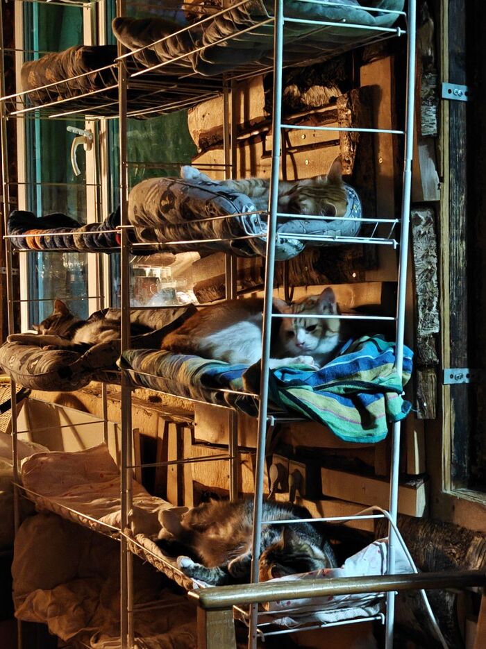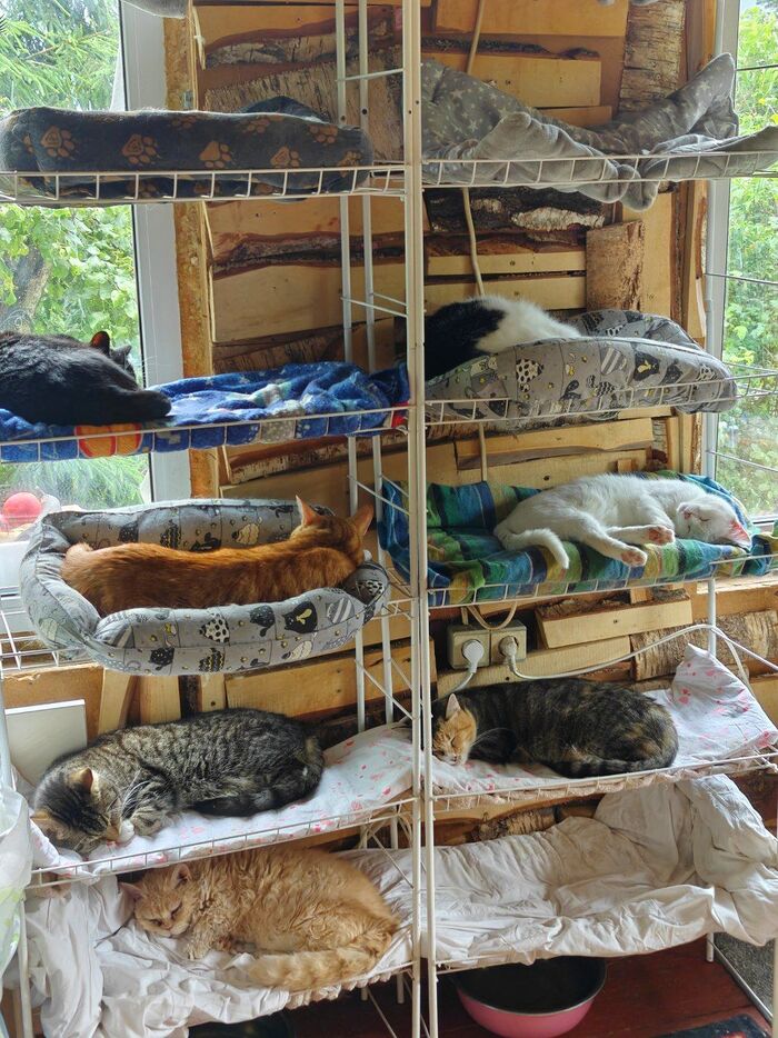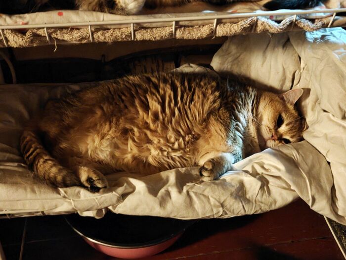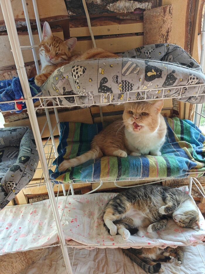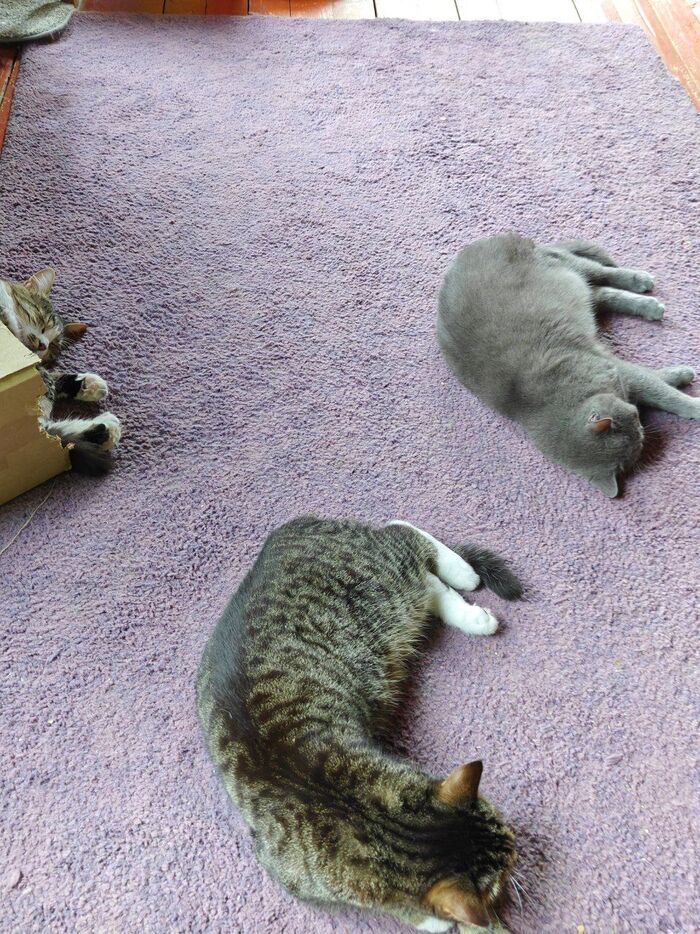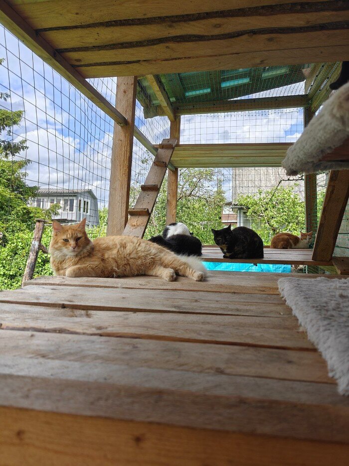 2. Меня топит. На полу в котовнике стоят деревянные поддоны, потому у котов чистые и сухие лапки. Ходят они в лотки, который я убираю каждый день. Но. У меня ужасно душно, каждый день с меня сходит семь постов, а котам пофиг. Они лежат на ветру, в прохладном месте в теньке (и ещё мой хитрый план сработал - я потихоньку переношу все лотки в котовник, чтобы коты их использовали именно там, пока всё идёт прекрасно).