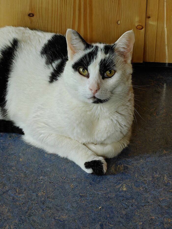 Скажу сразу - она не жирная. Пузо такое осталось после почти месячной замершей беременности. Оно было такое с самого начала. Сейчас это старая, беззубая киса (зубы удалили). Надеюсь, проживет подольше.