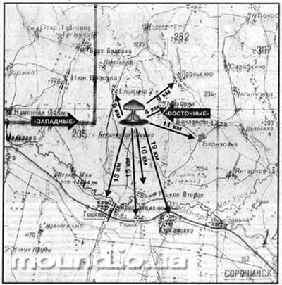 1) "Подвергалось ли опасности местное население? Однозначно - нет. Жители трех деревень (Ольховки, Маховки и Елшанки), расположенных на расстоянии 5-6,5 км от эпицентра взрыва, были заблаговременно выведены на безопасное расстояние. Деревни сгорели от воспламенения сухой старой соломы, покрывавшей крыши домов. Вместо них жители получили вновь отстроенные дома" (Воспоминания генерал-лейтенанта А.А. Осина, генерал-лейтенанта С. А. Зеленцова, подполковника Н.В. Даниленко).