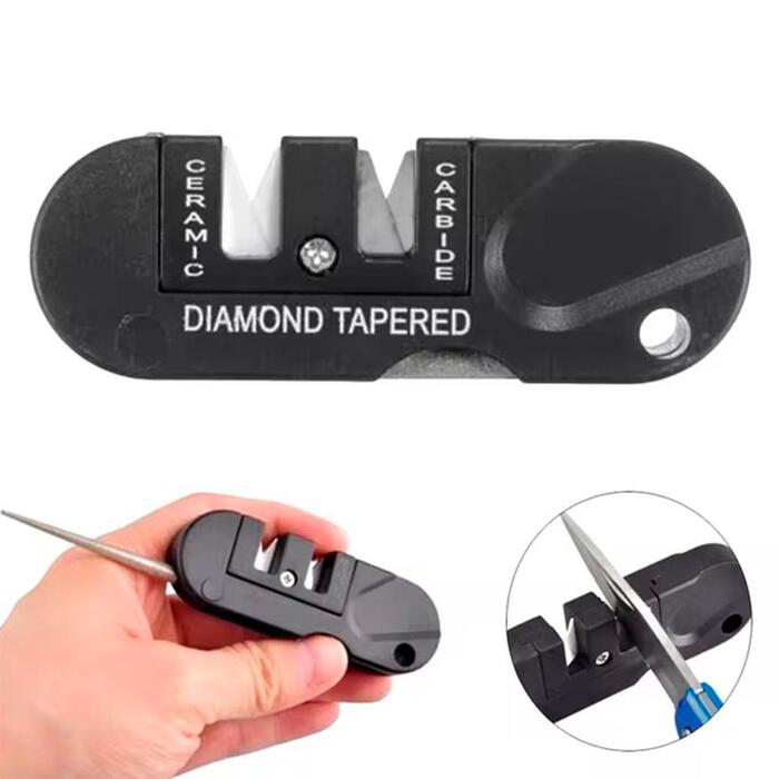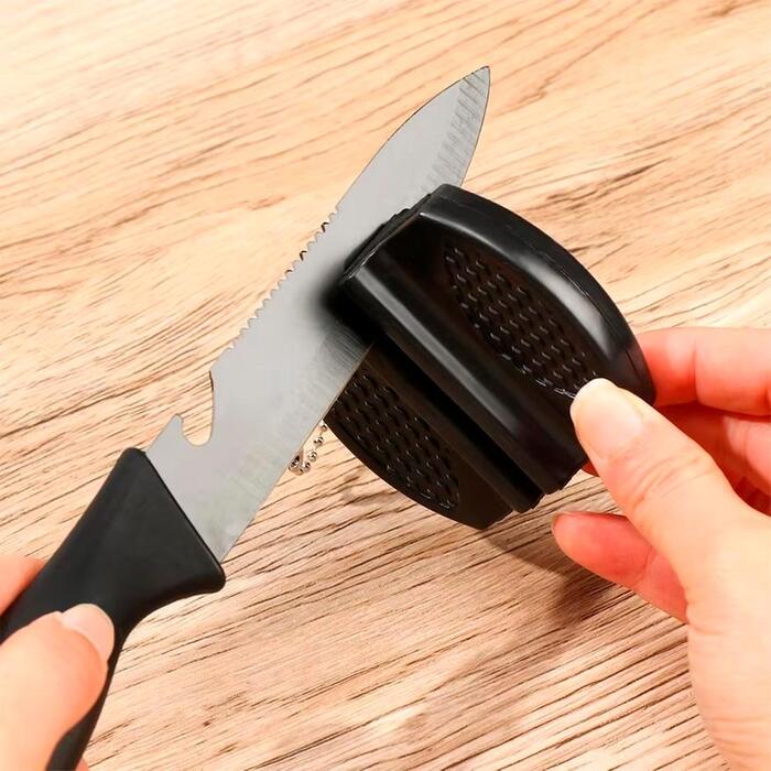 Корпус компактной многофункциональной точилки Knife Sharpener изготовлен из пластика ABS BPA free, т. е. пластик свободный от вредного химического вещества бисфенол А, а заточные элементы (ножи) изготовлены из керамики. Портативная заточка имеет отверстие для шнурка. В него можно поместить темляк для ножа, что обеспечит его удобную переноску. Этот компактный аксессуар специально разработан для любителей активного отдыха и прост в использовании. При заточке ножа необходимо просто вставить нож в прорезь и несколько раз потянуть его вперед и назад. Точилки для ножей подходят для охотничьих ножей, а также многофункциональных ножей, ножей для стейков, ножей для филе и т. д.