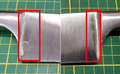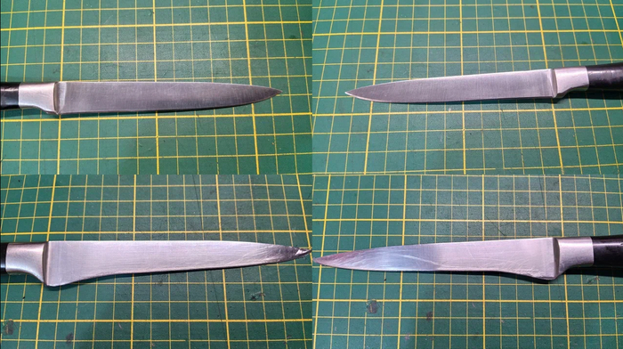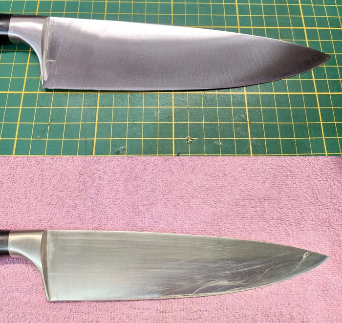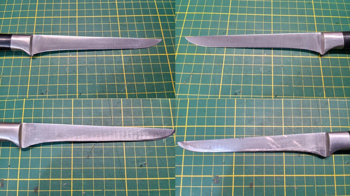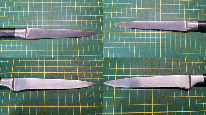 Универсалам пришлось сначала восстанавливать геометрию лезвия, попутно "редактируя" больстер, после чего уже шлифовать и затачивать.