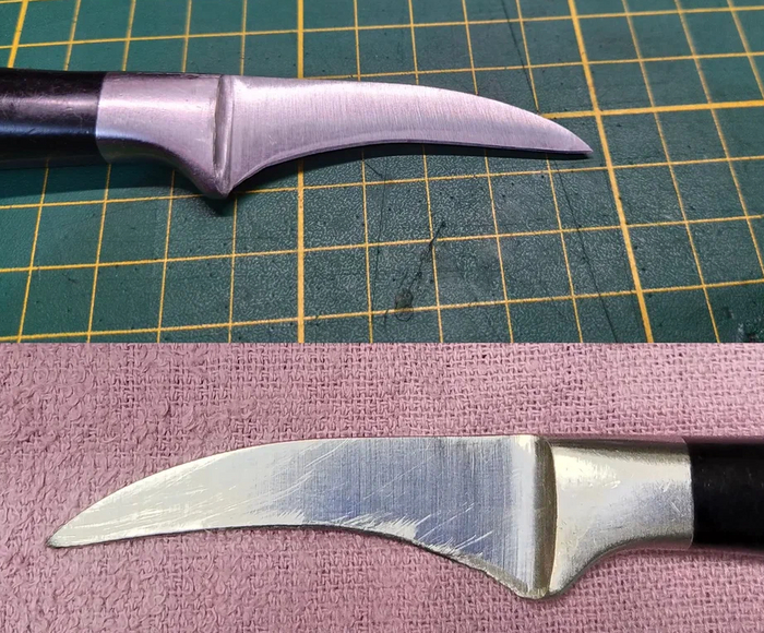 Первым в работу пошёл фруктовый. Сначала прошёл Вжиком, удалив все косяки по лезвию и убрав следы заточки. После заточил, правда с косяками, т.к. нет брусков для заточки внутренних радиусов (надо было круглым бруском с наждачкой, но это до меня уже после дошло).