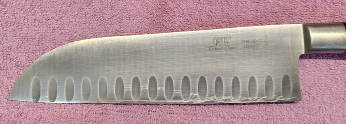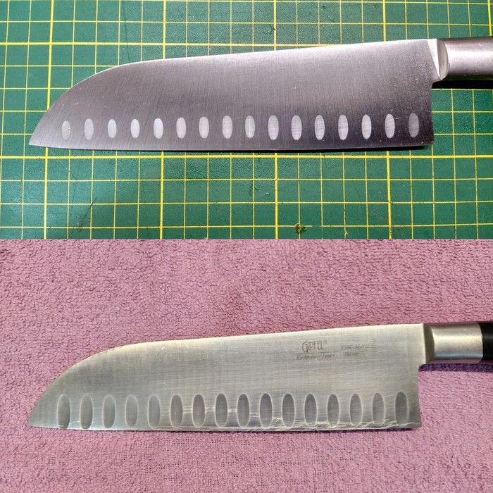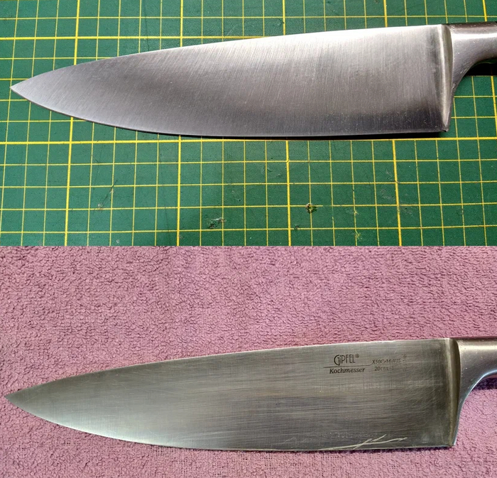 Но выплеснув эмоции, попутно высказав владельцу за попытку точить ЭТО на протяжной точилке, и полистав тырнеты, что за серия и как эти ножи выглядели до пережёвывания наждаком, решил взяться за восстановление функций заложенных инженерами-конструкторами. GIPFEL, PROFESSIONAL LINE, сталь X50CrMoV15, вполне себе нормальные ножи для кухни, но на любителя из-за толщины лезвия в обухе (про сведение ничего не могу сказать).