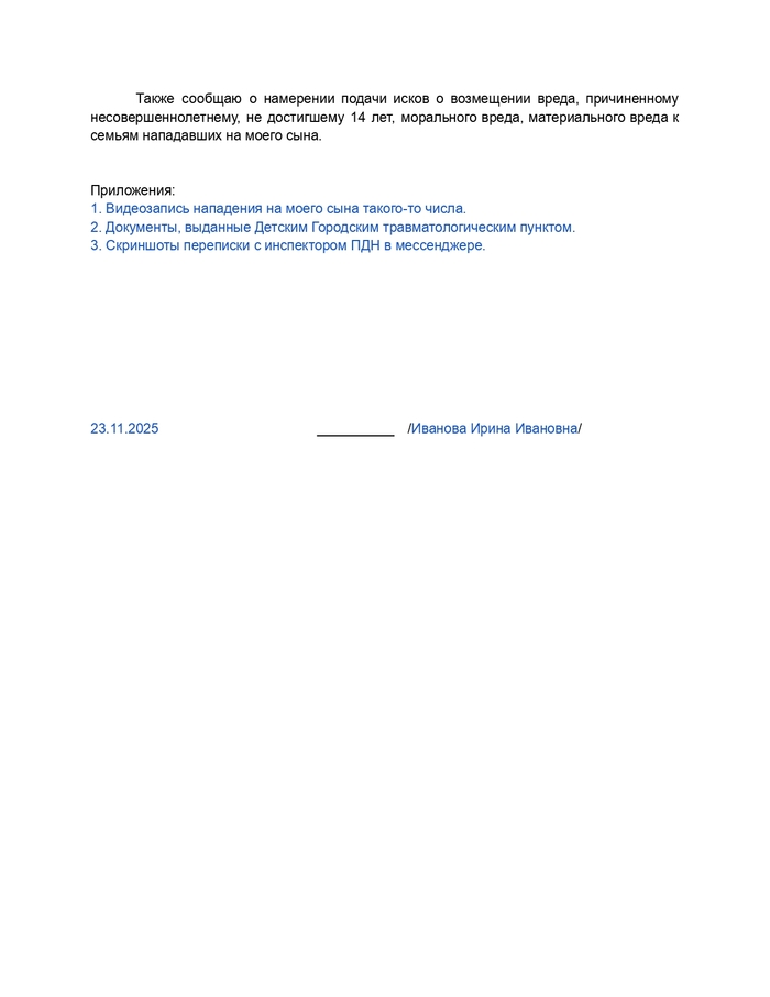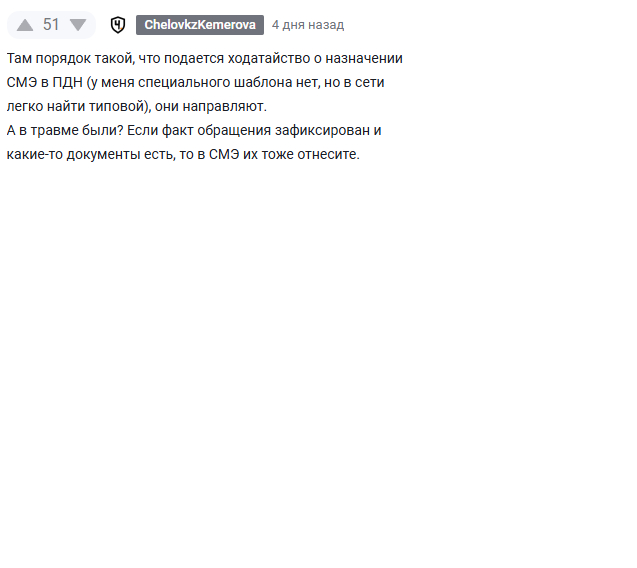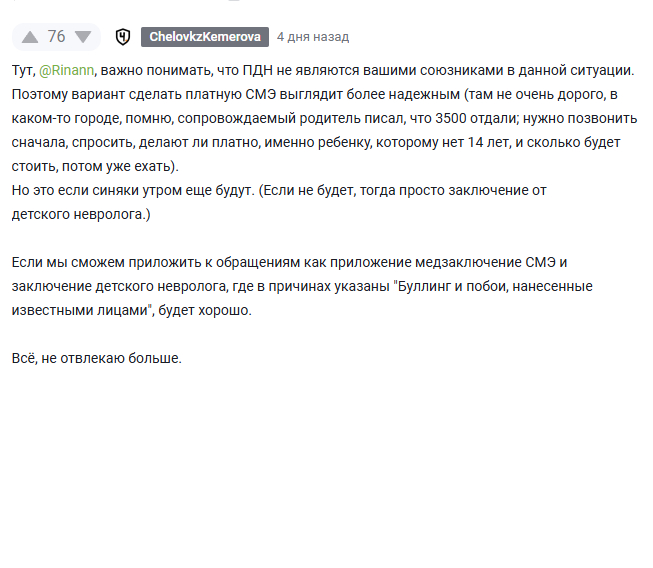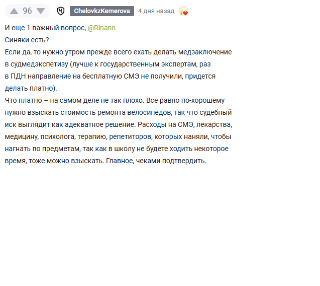Ладно. Родители пишут в мессенджере инспектору ПДН. Мол, если сейчас с ходатайством о назначении СМЭ подъедем, дадите направление? Те говорят, нет, "Направление на СМЭ предоставляется должностным лицом, когда это имеет доказательное значение", советуют обратиться в травмпункт. Родители сообщают: так мы собираемся иск подавать о возмещении вреда здоровью несовершеннолетнего, не достигшего 14 лет, речь как раз о доказательном значении для суда. Инспектор стоит на своем: вам в травмпункт. (Так как я не являюсь участником той беседы, скриншоты переписки выложить не могу, но родители позже прикрепят их к обращениям, посмотрим, что скажет проверка.)