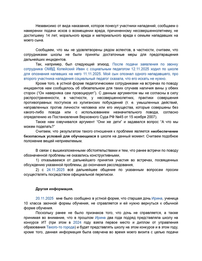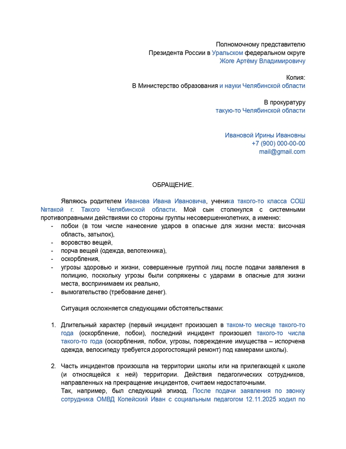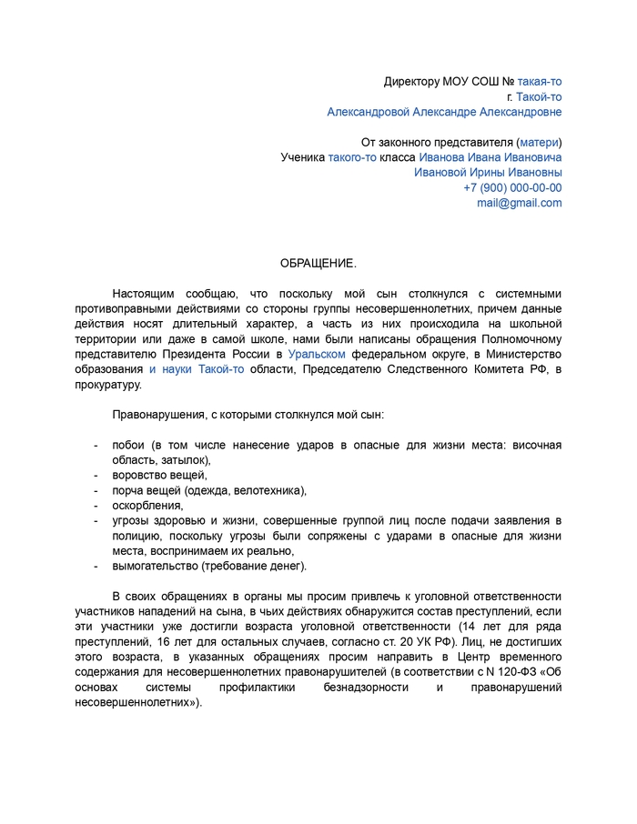 С согласия родителей кратко расскажу о том, что сделано к этому моменту, + выложу тексты подготовленных обращений (имена в них изменены, при необходимости, столкнувшись с похожей ситуацией, можете эти обращения адаптировать под себя).
