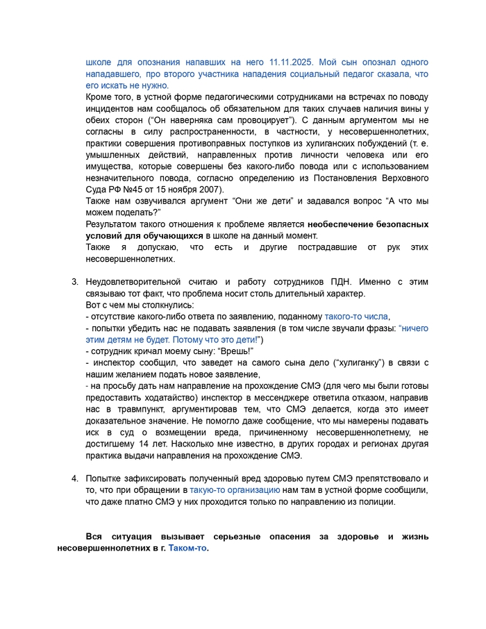 Тем не менее, вижу, что ситуация имеет осложняющие факторы (физический вред здоровью, некорректные позиции школы и сотрудников ПДН, которые только способствуют происходящим нападениям), сразу пишу ряд рекомендаций, исходя из опыта столкновений с похожими случаями.