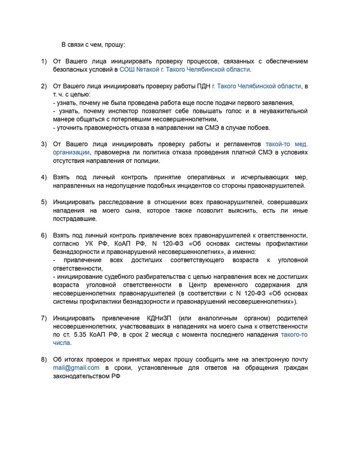 (По совету юриста добавлен пункт с просьбой "Проверить наличие в действиях правонарушителей признаков пропаганды АУЕ-субкультуры (признанной в РФ экстремистской организацией, чья деятельность запрещена)".)