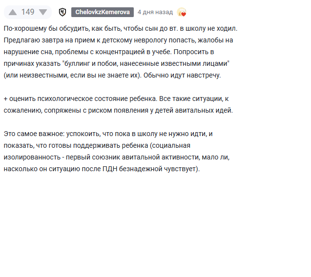 3. В целом, желание ребенка пойти в школу на фоне контрпродуктивной встречи с инспектором ПДН могло быть признаком того, что он разуверился в возможность получить защиту от взрослых (учителя, полиция) и решил разобраться с проблемой сам в духе советов из 80-90-х. Например, по одному пытаться выловить задир или типа того, что просто усложнит ситуацию еще больше и приведёт к новому ущербу. (Сразу спойлер, в этой ситуации ничего такого не было.)