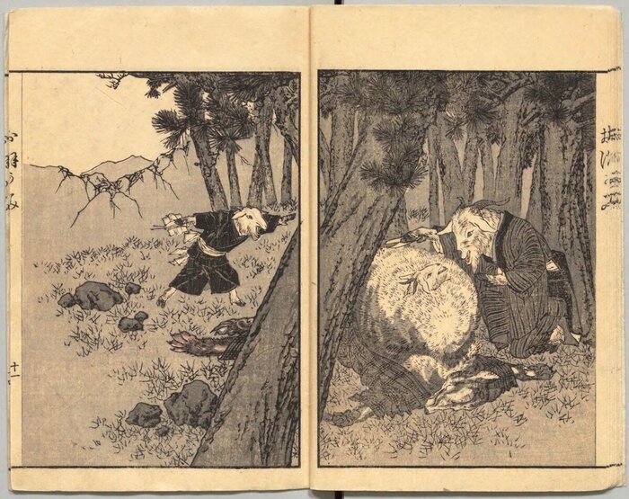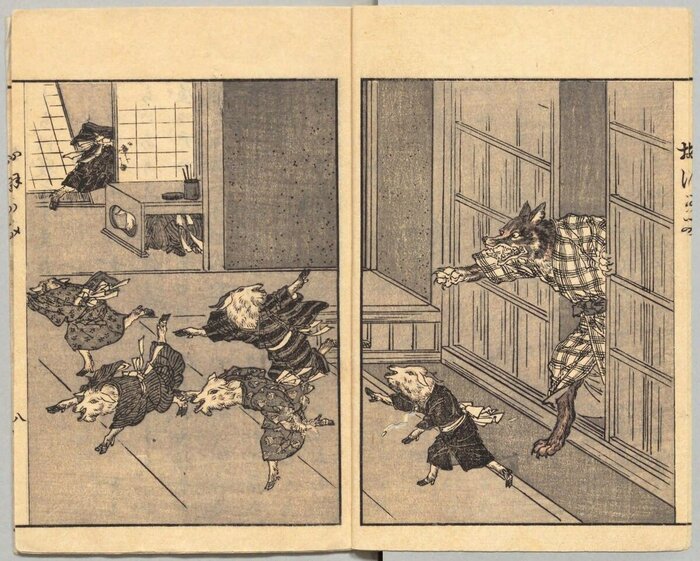 Помня, как её муж - самурай, после поражения в Сацумском восстании, произвёл сеппуку, женщина-коза производит полостную операцию над спящим волком ("хара" - живот, "кири" - резать).