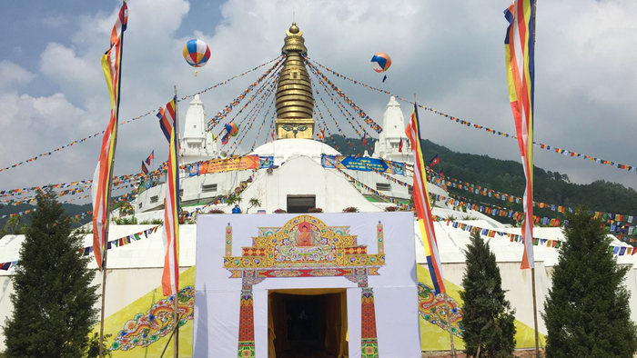 За главными входными воротами находится сооружение – ступа, это башня Мандала, возведённая, чтобы отметить великие заслуги мастеров буддизма направления Дзэн и буддизма «алмазной колесницы» (Вадждраяна). Пропорциональная по своему архитектурному решению, от основания до вершины, башня имеет форму цветка и полной луны в плане, что воплощает идёю о гармонии земли и неба.