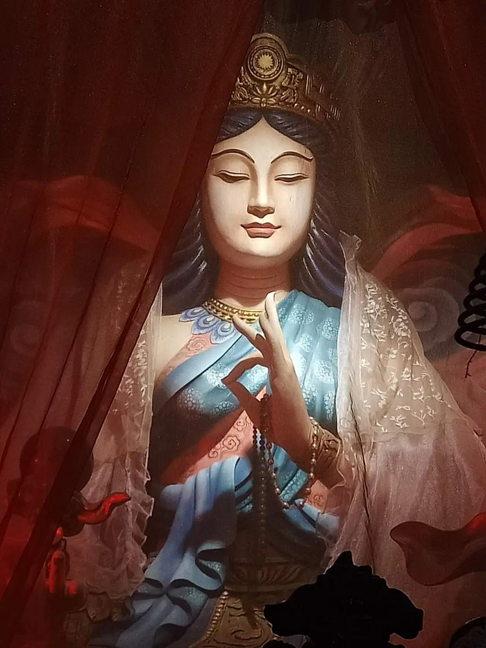 Структура храма состоит из трёх залов, 2 этажей и 8 крыш. Внутри находятся таблички с иероглифическими надписями и только одна статуя, изображающую священную местную богиню, имеющую благородный, роскошный и величественный вид.