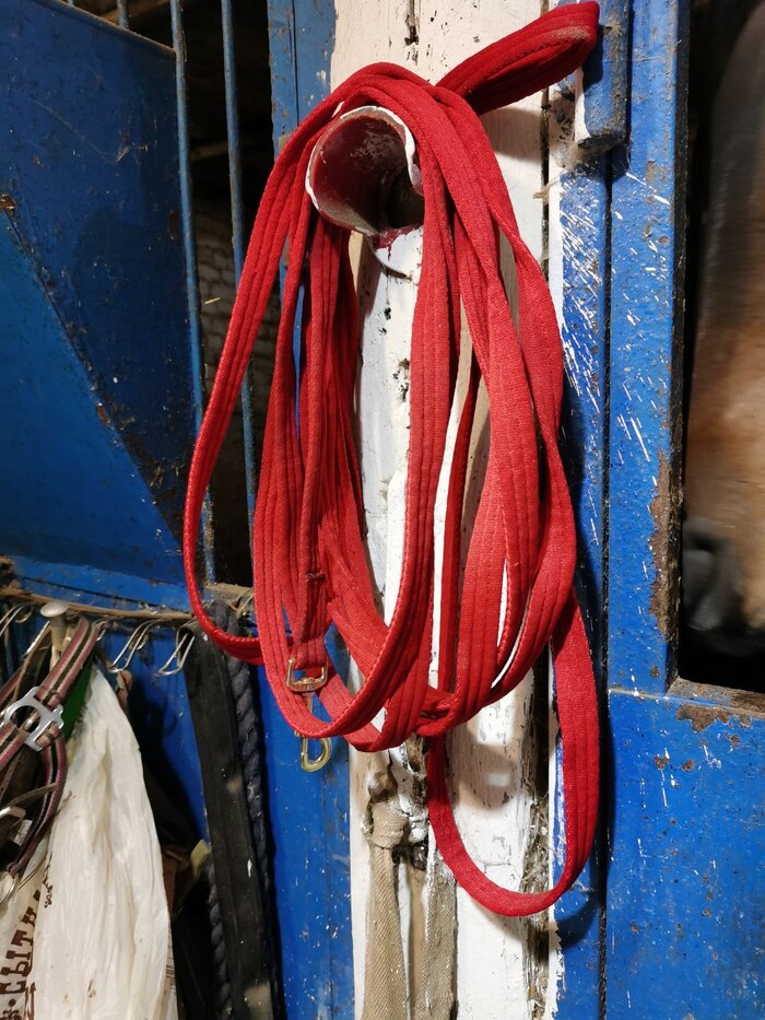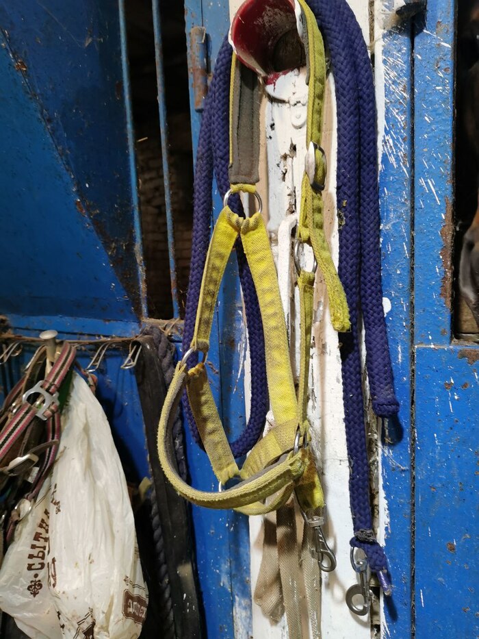 Первое, что нужно купить, это недоуздок. Он нужен, чтобы водить лошадь из денника до левады и легче было выловить в леваде, когда надо заводить домой. Выбирать лучше с карабином без выступающих элементов, либо следить, как именно вы застегиваете его