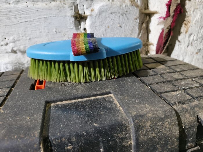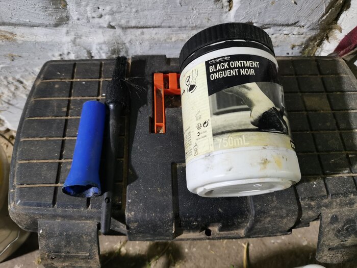 Мне очень нравится чистить лошадь, пшыкать на нее вкусным кондиционером, а еще мазать ей копыта. Для это у меня есть специальная мазь для копыт и кисточка