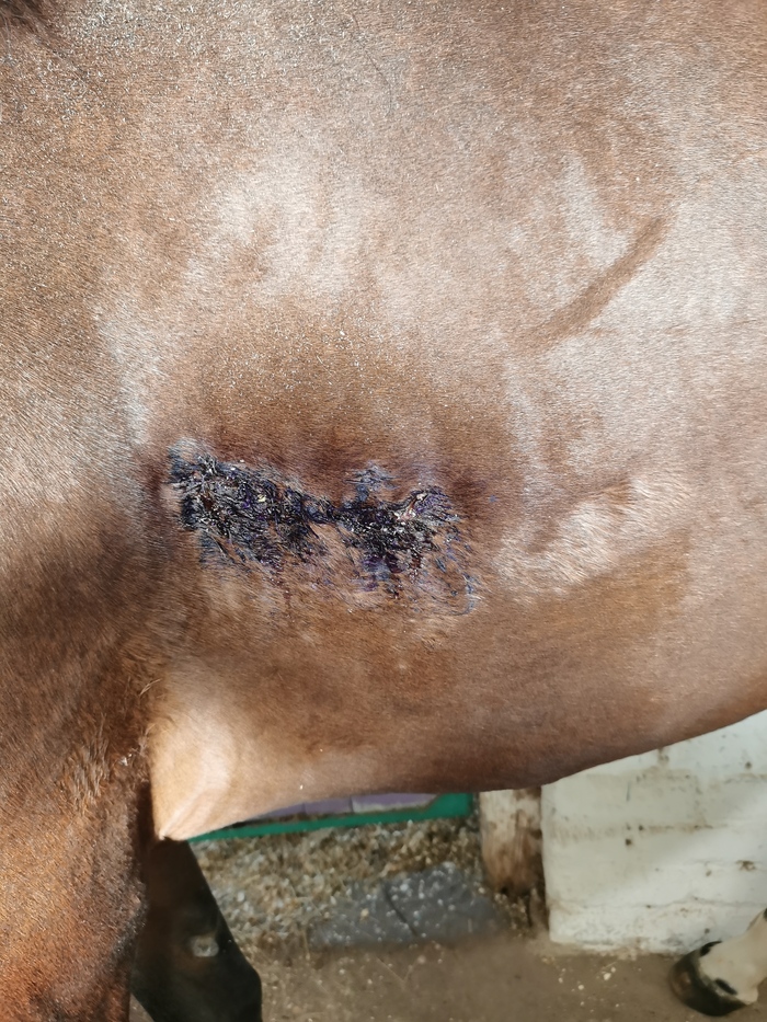 Забегаю в леваду и стараюсь поймать лошадь и успокоить ее. Пока она бегает, я увидела кровь на боку. И сразу закричала о помощи. Мой тренер Марина, который в это время был в той леваде, в которой я до этого сидела, быстро прибежала ко мне. Мы завели кобылу в конюшню и поставили на развязки. И стали обзванивать вет. врачей. До одного мы смогли дозвониться, но он может приехать только через 1,5 часа. Мы своими силами, ну если быть точнее Марина в это время начала первоначальную обработку ран. А я просто сидела и тряслась. И плакала. И ходила туда-сюда, не зная, куда себя деть.