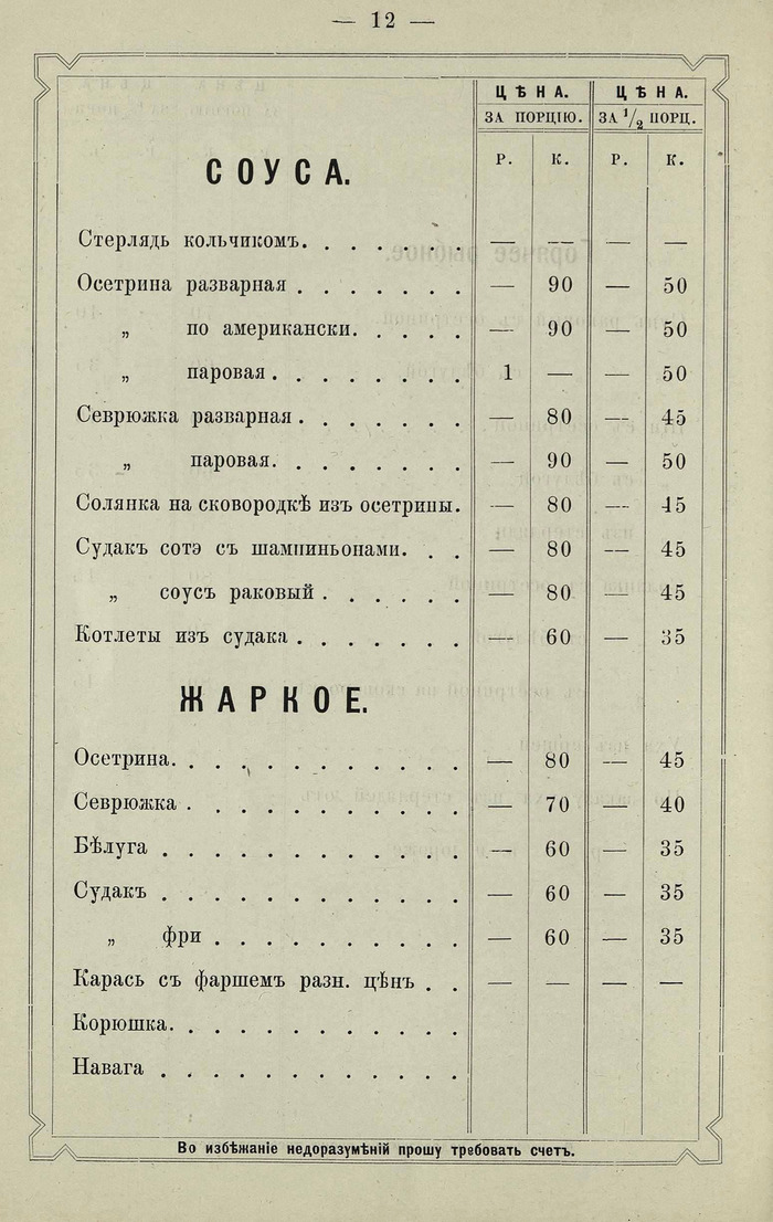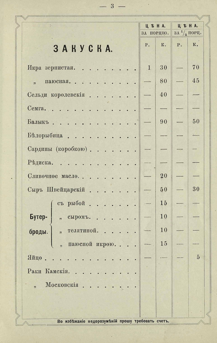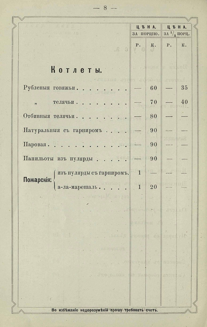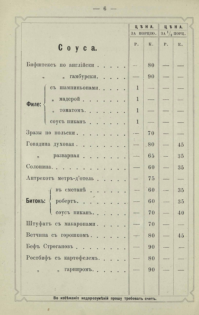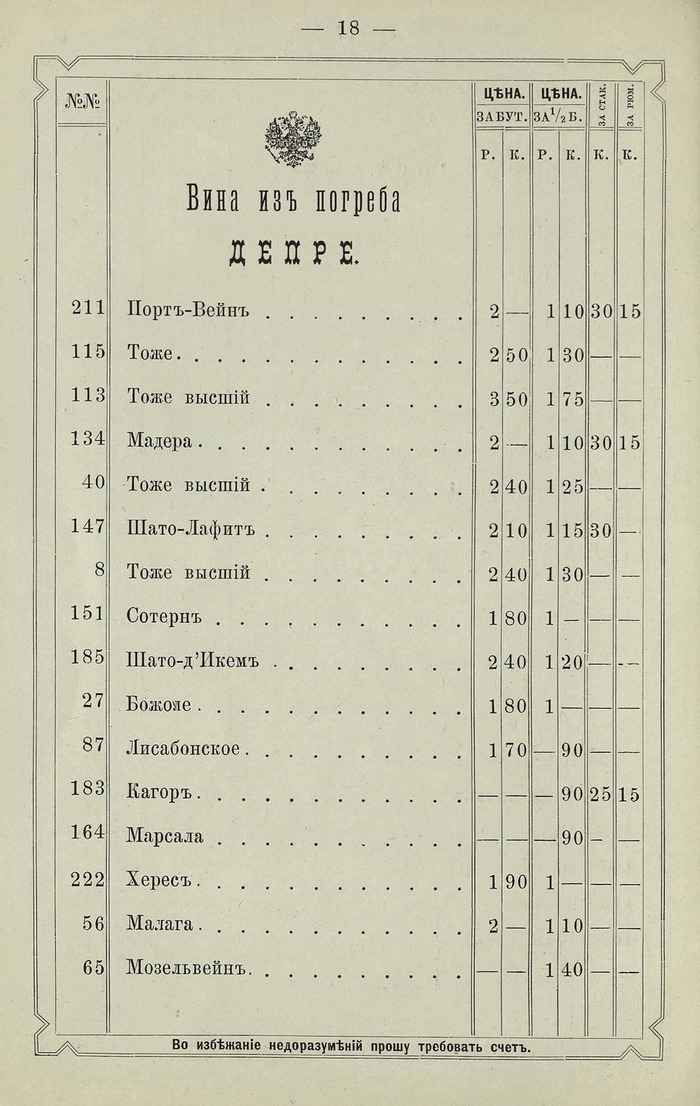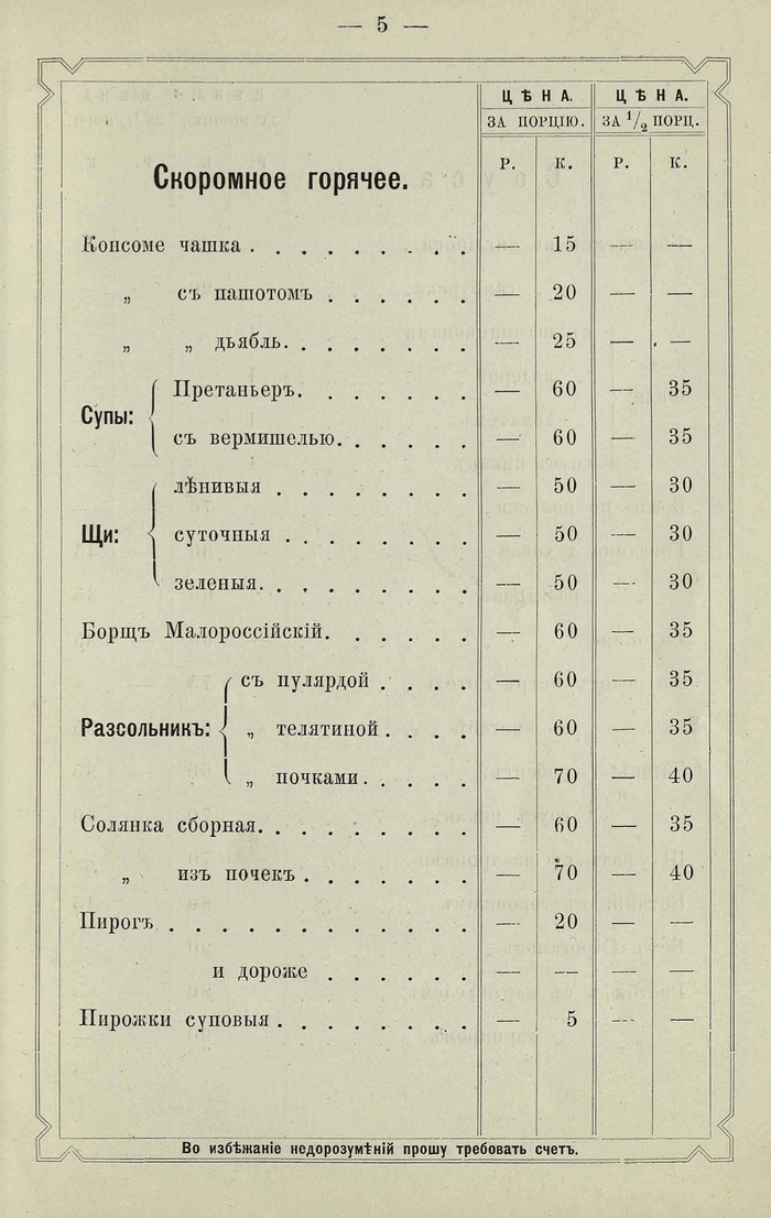 Прейскурант кушаньям и винам в трактирах в Москве 1896 год