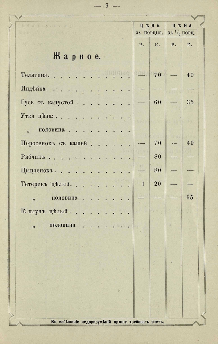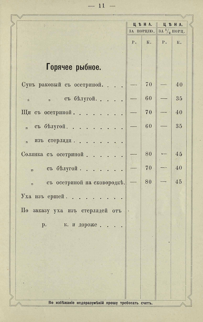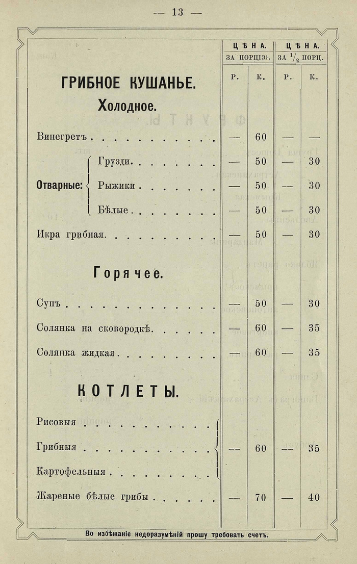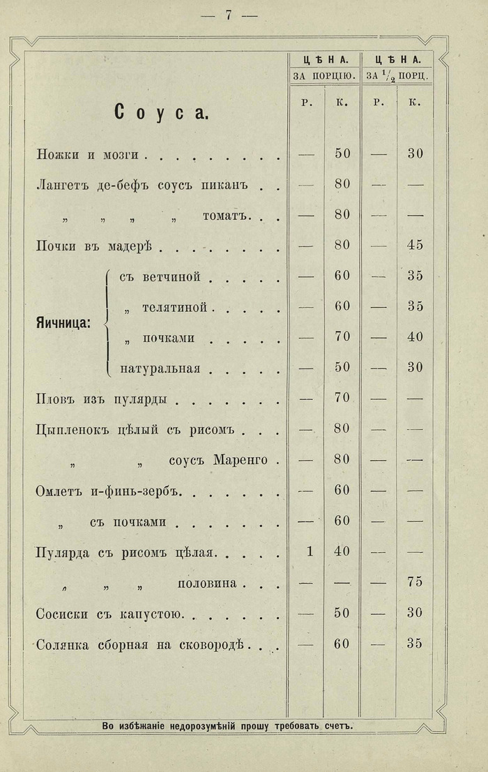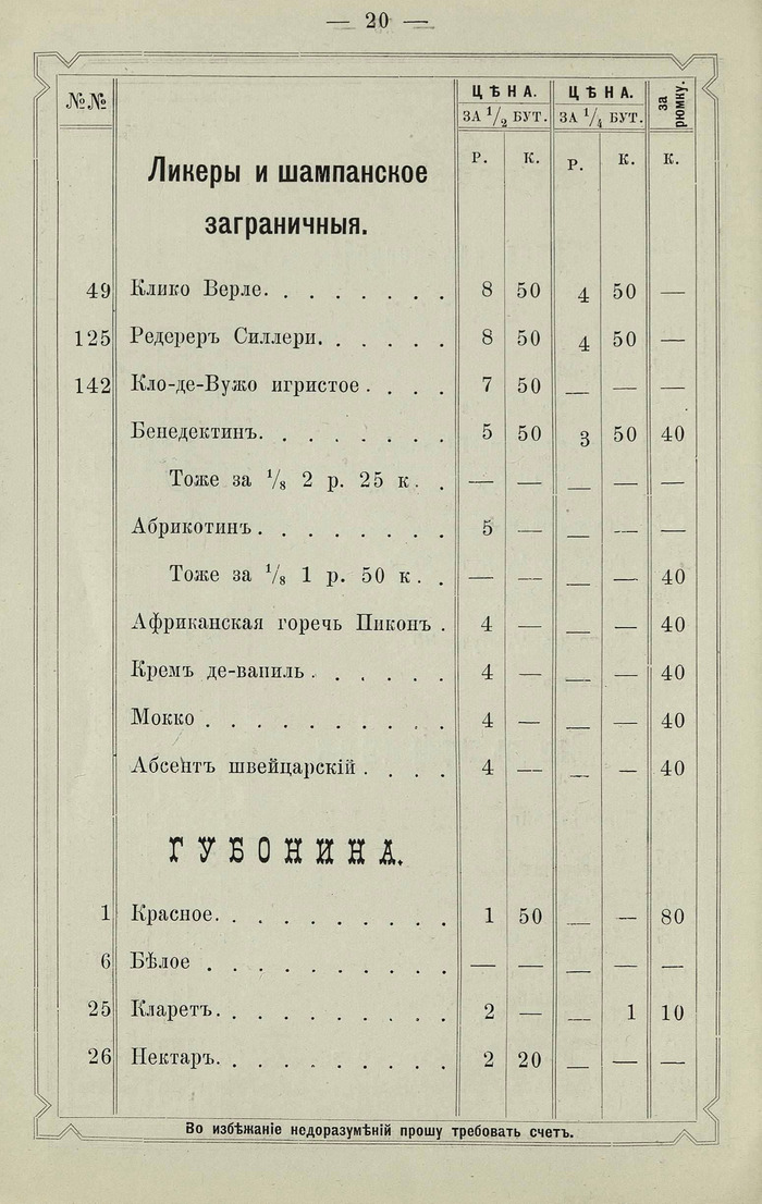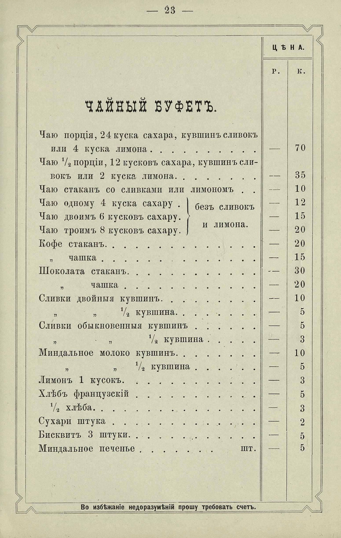 Прейскурант кушаньям и винам в трактирах в Москве 1896 год