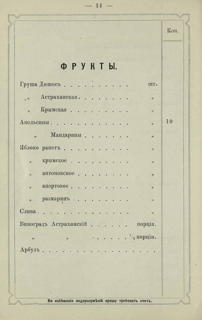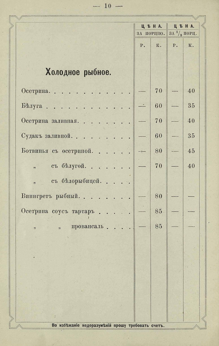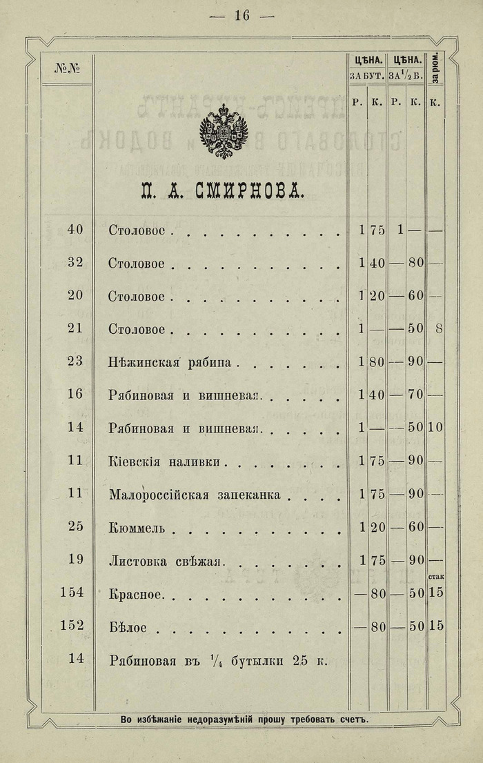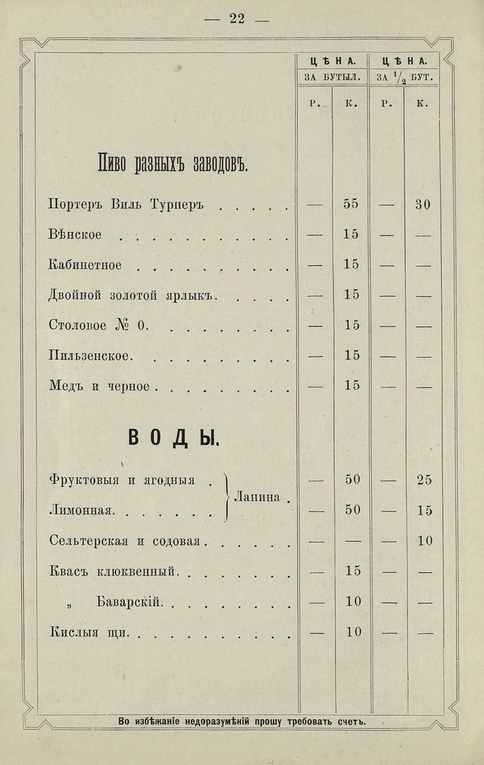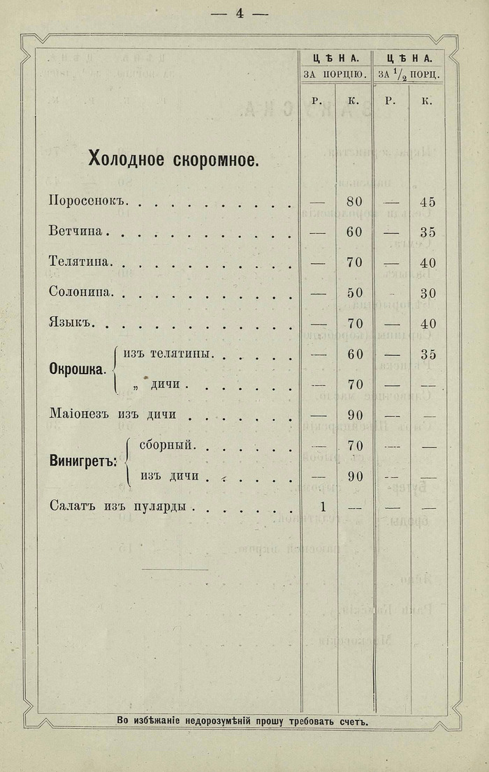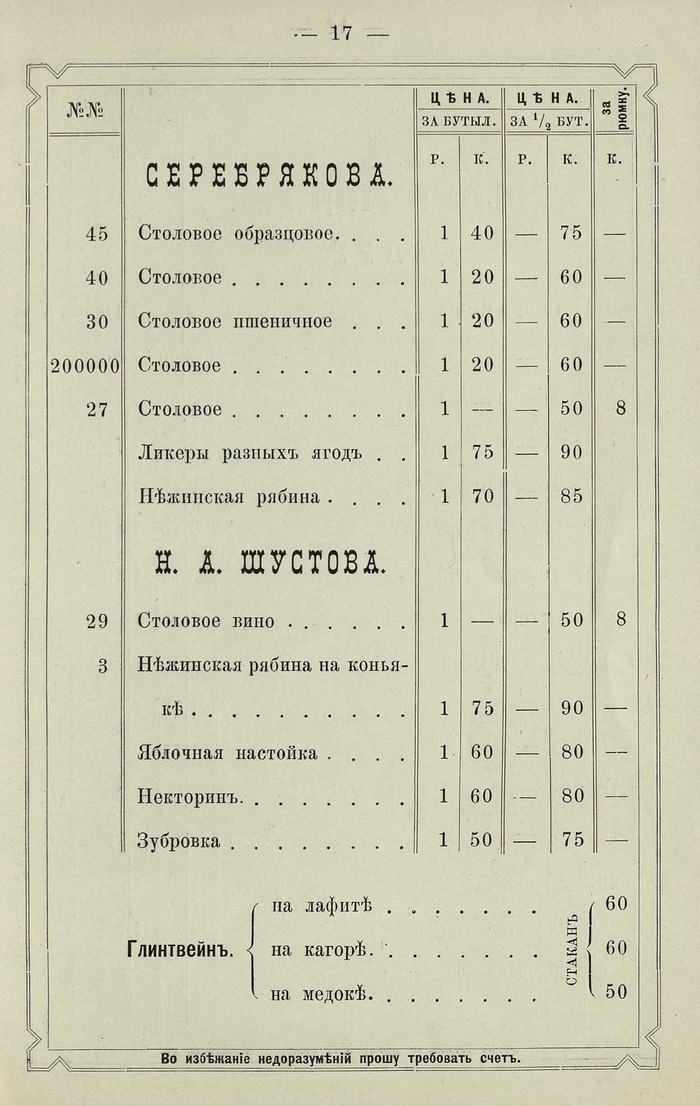 Прейскурант кушаньям и винам в трактирах в Москве 1896 год