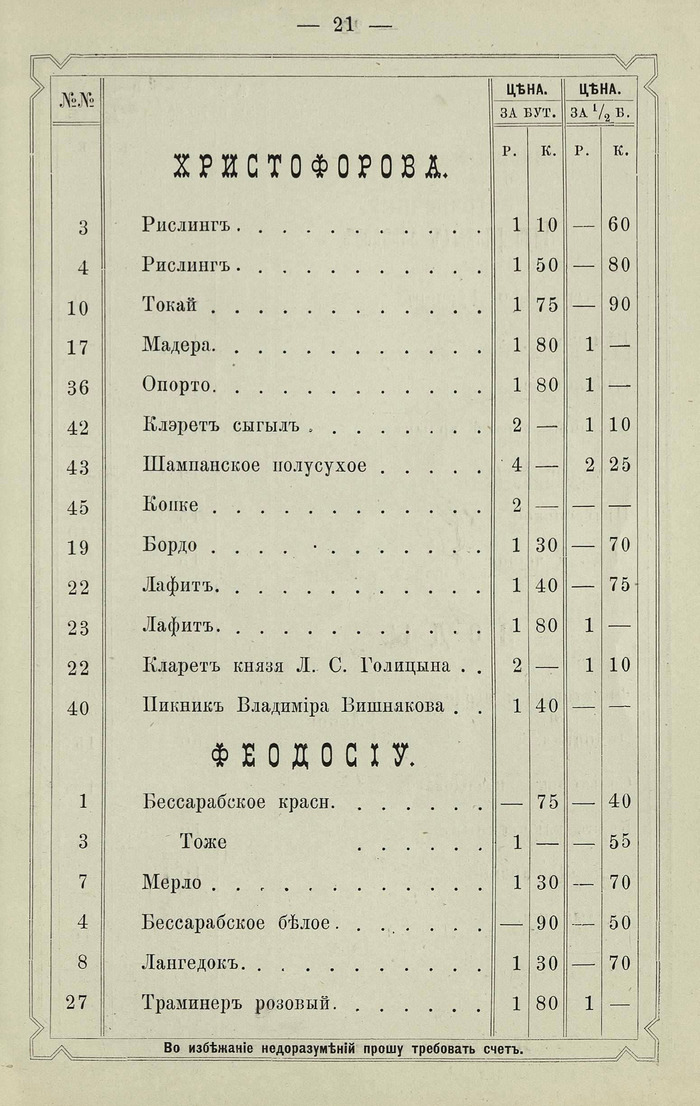 Прейскурант кушаньям и винам погребов в трактирах Н. Е. Третьякова в Москве 1896 год