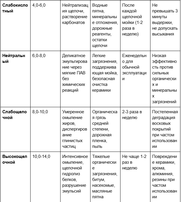 Кислотные шампуни с pH 2-6 предназначены для периодического использования — удаления минеральных отложений и нейтрализации остаточной щелочи. Применение кислоты чаще 1-2 раз в месяц на регулярной основе приводит к травлению лакокрасочного покрытия.