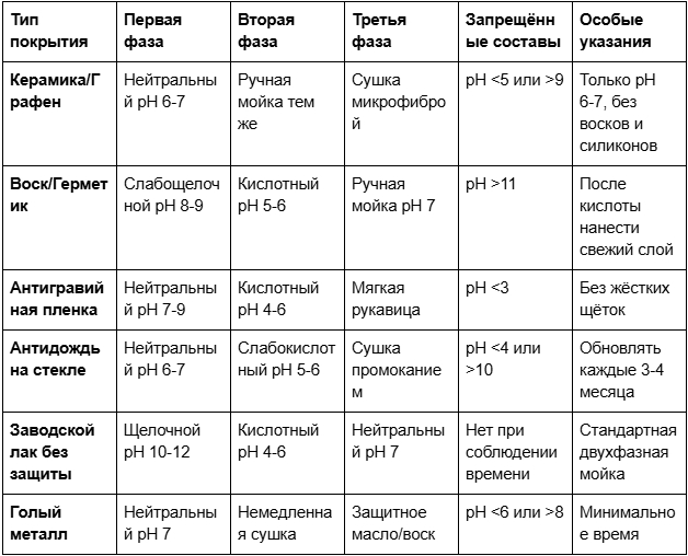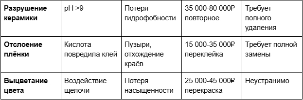 Кислотные шампуни особенно опасны для полиуретановых антигравийных пленок — некоторые составы с pH <3 растворяют клеевой слой, вызывая отслоение плёнки. Виниловые декоративные плёнки изменяют цвет и текстуру при частом контакте с кислотой. Гидрофобные покрытия на стеклах на основе силиконов или фторполимеров деградируют, сокращая срок службы антидождей с 6 месяцев до 2-4 недель.