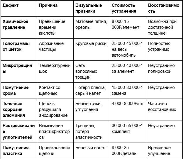 Эти дефекты не удаляются повторной мойкой и требуют абразивной полировки с удалением 5-15 микрон лака. Современные автомобили имеют толщину прозрачного слоя всего 40-80 микрон — после 3-4 агрессивных полировок покрытие пробивается до базового слоя, требуя полной перекраски элемента стоимостью 25-40 тысяч рублей за деталь.