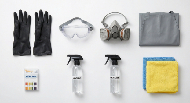 При высыхании остатки щелочи кристаллизуются, образуя белесые разводы на поверхности. При протирке микрофиброй ощущается характерная «цепкость» — ткань прилипает к остаткам химии.