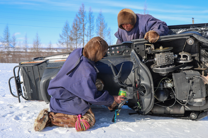 У нас тут с оленеводами на съёмках сломался снегоход в тундре. Вот его чинят.