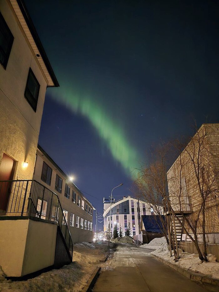 Уже засыпаю и тут отчётливо слышу в соседнем номере фразу: «Северное сияние!». Дальше за минуту — куртка поверх пижамы, задний двор отеля с сугробами по бедро и одно из самых эпичных полярных сияний в моей жизни.