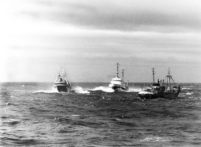 Исландский траулер Ver (слева) пытается перерезать трал британского траулера Northern Reward (справа). Британский буксир Statesman (в центре) пытается ему помешать
