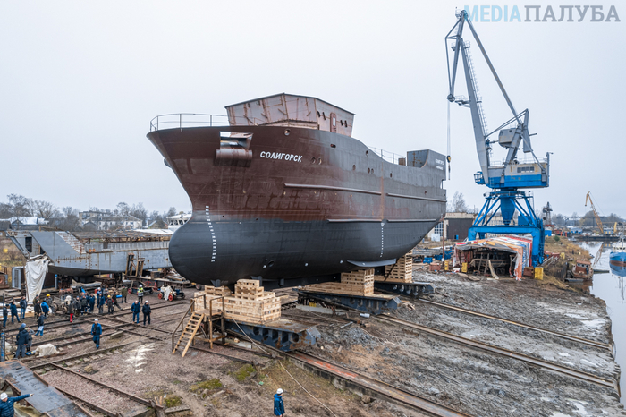 Второй теплоход проекта «Кильдин» находится в эллинге верфи, идет формирование секций и корпуса. Примерная готовность — 22%.