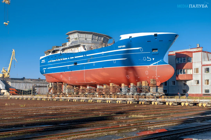 На ярусолове «Марлин» проекта MT1112XL монтируются трубопроводы судовых систем, подключается электрооборудование. Подготавливаются системы главных дизелей к запуску, и ведется работа по укладке бетона в морозильном трюме. Техническая готовность судна составляет примерно 98%.