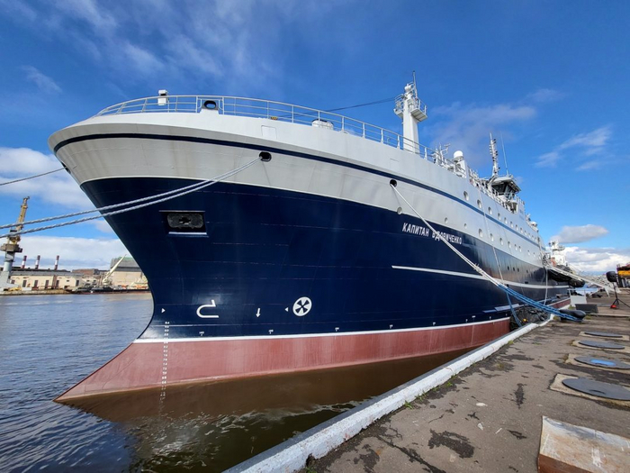 Для начала вкратце о компании-заказчике: ООО «Марфиш» образовалась в 1992 году, и 2022 год – юбилейный для предприятия. Работа компании началась с одного МРТК типа «Балтика» (причем судно до сих пор находится в эксплуатации после модернизации, проведенной по проектам КБ «Адомат»). Всего в составе флота «Марфиша» восемь подобных МРТК и все они прошли модернизацию – на них заменены главные и вспомогательные двигатели, поменяны сухие трюмы на наливные, установлены новые эхолоты и гидролокаторы.
