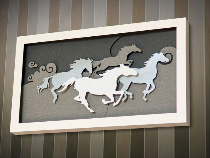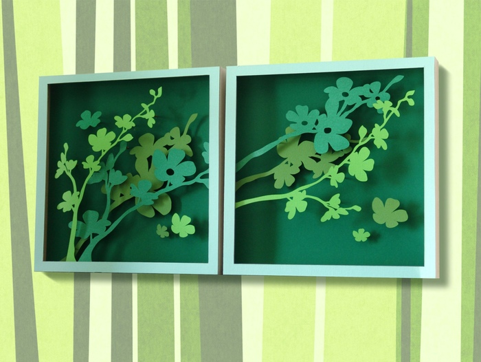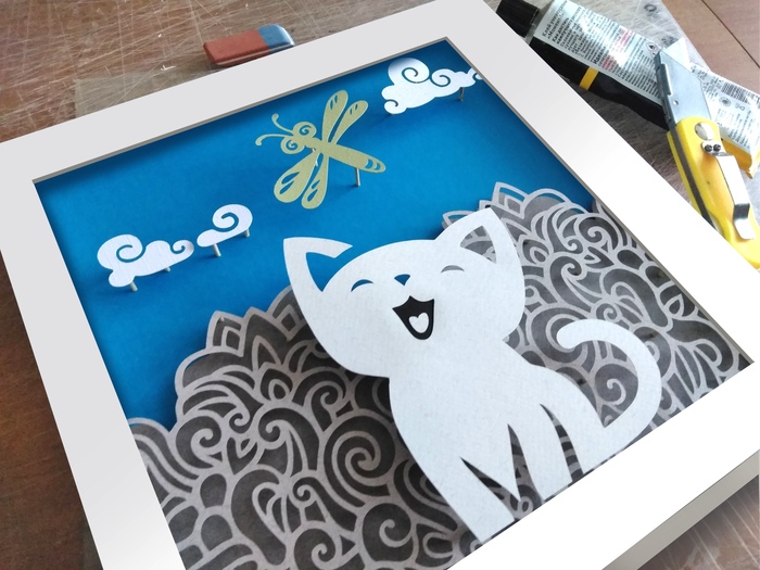Декоративные картины небольшого размера из художественного картона и цветной художественной бумаги. Специфика картин в том, что они состоят из вырезанных слоёв бумаги, элементов, которые составляют единую композицию. Выглядит это вот так...