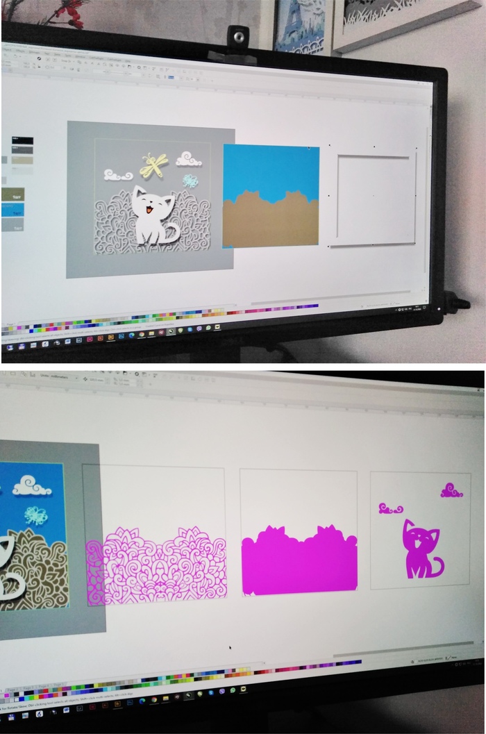 А дальше,... снова углубляемся в дебри компьютерных программ. Берем нашего Котика... и препарируем его. То есть раскладываем по частям. Все слои картины по разным углам. Замеряем, проверяем, выставляем... Одним словом - готовим к вырезке детали будущей композиции.