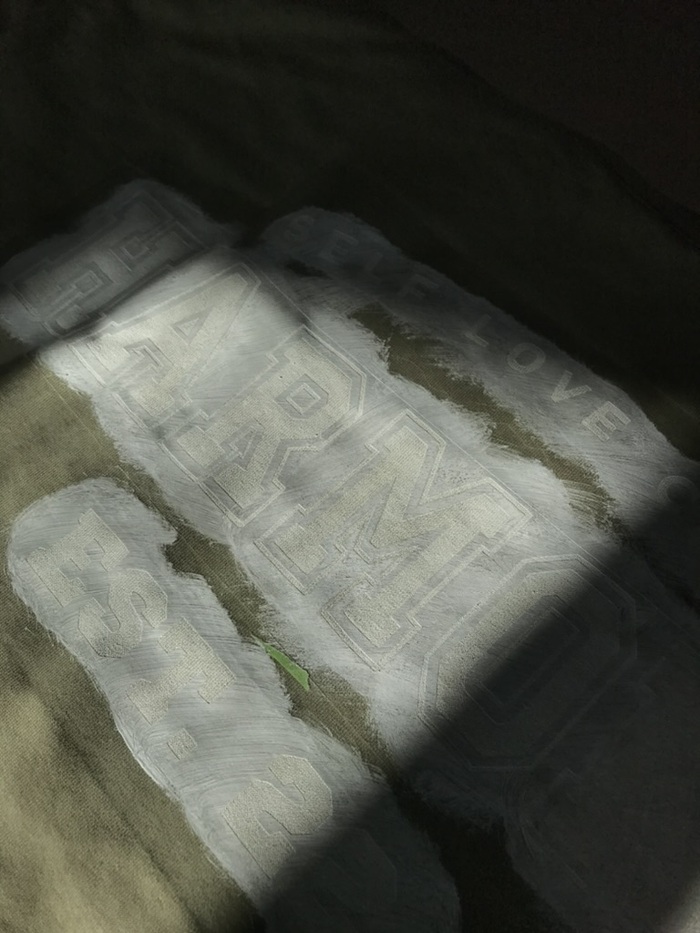 Затем приклеиваю трафарет к вещи и закрепляю его.