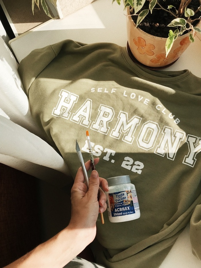 В прошлом году в тренде были вещи с надписями (в спортивном или винтажном стиле), они были почти в каждом магазине и у многих модниц в гардеробе. Ну а я, как мастер по росписи одежды, решила сделать себе такую вещь сама и с той надписью, которую хочу.