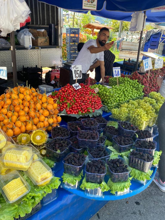 Рынки в Анталии кочуют с места на место, и их всего 7 — по дням недели. В Лиман рынок приезжает по вторникам. Если тупить, и не торговаться, не ориентироваться в ценах, могут нагреть, причем в несколько раз. Но если иметь понимание о происходящем, можно закупаться, чуть дороже чем бесплатно. Вот реально, покупаешь 4 набитых пакета еды на 1500 рублей…