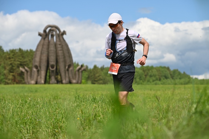 Обгоняю нескольких человек, которые пытаются преодолеть участки по обочинам или неторопясь бредут через лужи, выбирая безопасные участки. И вот снова вбегаю на территорию Никола Ленивца. Трасса идет прямо через кемпинговую поляну, люди подбадривают, говорят что до финиша осталось совсем немного. Что на самом деле не совсем так, после лагеря дорога поворачивает не к финишному коридору, а к самым необычным артобъектам, а потом к берегу Угры. На трассе много гуляющего народа, они стараются пропускать бегунов, и каждый бегун получает свою долю слов поддержки. Спасибо вам! Новая горка. Снова крутой подъем на берег реки. Думаю подняться шагом, но вижу затаившегося фотографа. Нет уж, на фотографии я шагать точно не буду. Перехожу на бег, хоть и медленный.