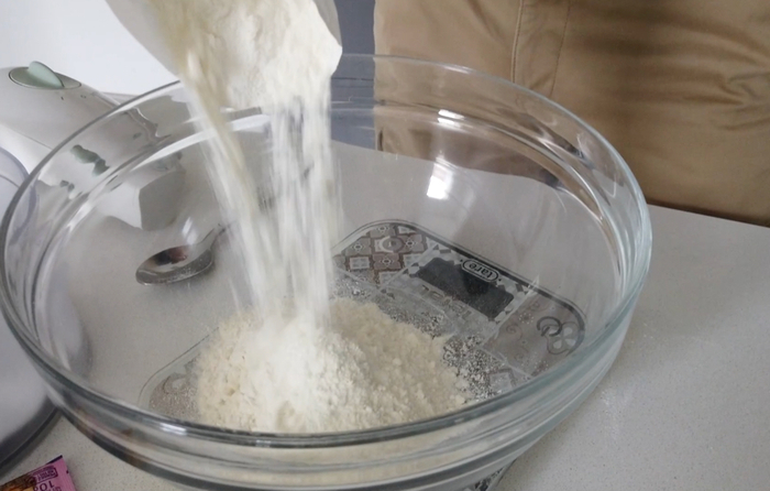 В муку всыпаем разрыхлитель, перемешиваем и отставляем в сторону.