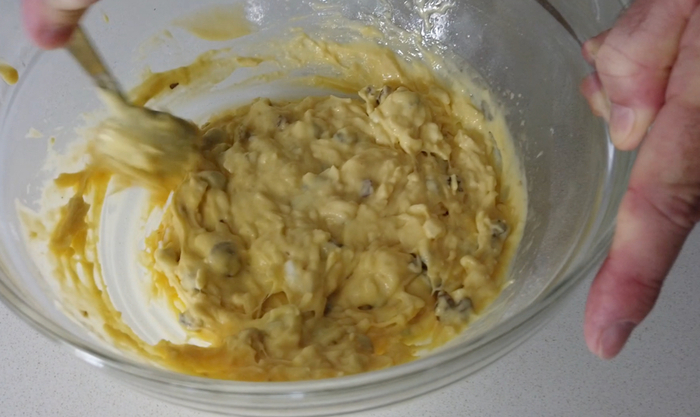 Добавляем изюм (можно предварительно замочить его минут на 20 в достаточно горячей воде). Вливаем масло, последний раз перемешиваем. Получается липкое, но не слишком жидкое тесто.