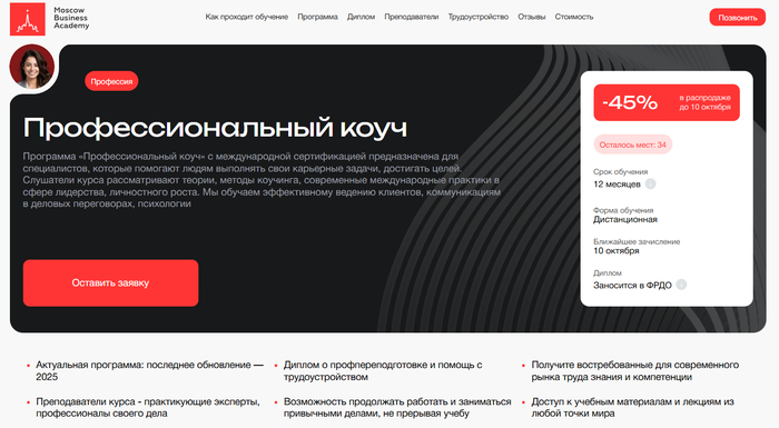 Бизнес-тренер (коуч) от IAB — дистанционный курс для быстрого старта в профессии. Обучение длится 256 часов, а стоимость по акции составляет 11 400 рублей. По окончании вы получите официальный диплом с международным приложением. Программа включает в себя модуль по созданию личного бренда в социальных сетях, что позволяет выпускникам эффективно привлекать первых клиентов и формировать профессиональное портфолио сразу после завершения учебы.