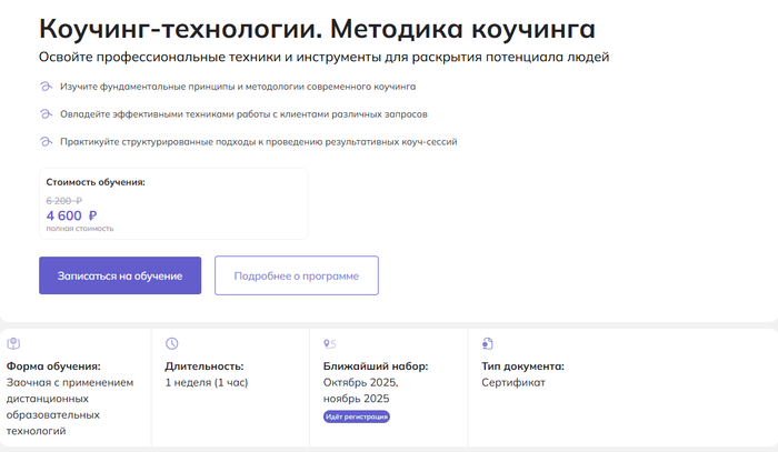 Основы коучинга: курс обучения базовым инструментам от МГППУ — программа повышения квалификации для начинающих от государственного вуза. Объем — 72 часа, стоимость — 20 000 рублей. Выдается удостоверение, а знания пригодятся менеджерам и психологам. Особое внимание уделяется этическому кодексу коуча и юридическим аспектам конфиденциальности, что формирует ответственный подход к будущей практике и защищает как специалиста, так и клиента.