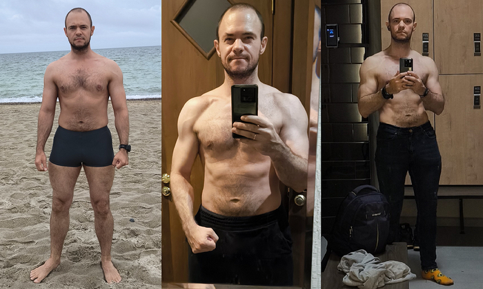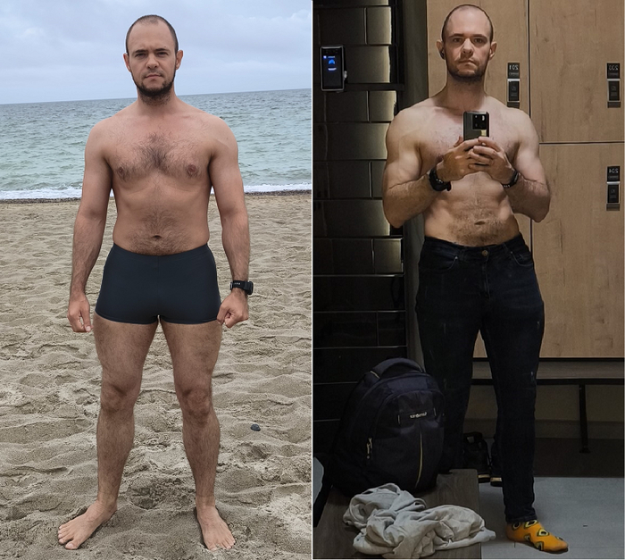 До – июль на море, максимально расслабленный в плане питания. В середине – дома, в октябре. Слева – недавно в зале.