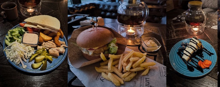 А в субботу и воскресенье можно есть как нормальный человек: сходить в кафе или ресторан, заказать что хочется. Вот, например, моя шаверма, бургер и вкуснейший чизкейк из выходных дней. Всё в рамках поддерживающих калорий (~2800 ккал).