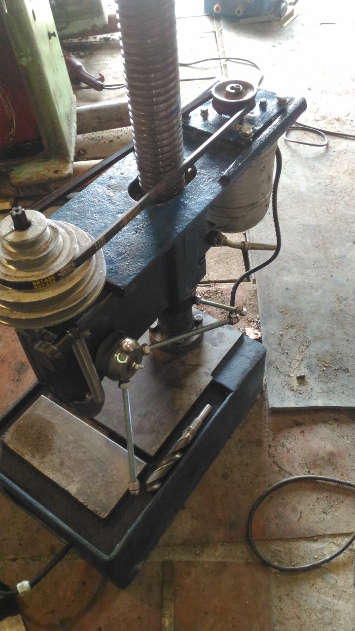 Также занялся и купленным до кучи сверлильным станком. Там, конечно, тоже много что нужно было сделать. Все ручки на нем были сломаны, большая часть отсутствовала вовсе, резьбы сорваны. Приколхожена какая-то левая пружина от дивана. На двигателе отсутствует шкив. Шкив нужен с пятью ручьями. Такой я, конечно, не найду, его придется делать самому когда запущу токарный станок. А пока временно поставил первый попавшийся купленный шкив подходящего диаметра. Одной скорости станка на первое время будет достаточно. Также разобрал двигатель и заменил закисшие подшипники (также на хорошие японские). К сожалению, двигатель успел поработать на закисших подшипниках и посадочные места немного разбило. Подшипники на них садились очень свободно. Для защиты от проворота и дальнейшего износа посадочных мест, посадил все это дело на фиксатор резьбы. Шпоночный паз на двигателе также был разбит, поэтому когда напрессовал шкив, рассверлил шпоночные пазы шкива и вала подходящим сверлом, нарезал там резьбу и вкрутил в это место болт. Он пока побудет шпонкой.