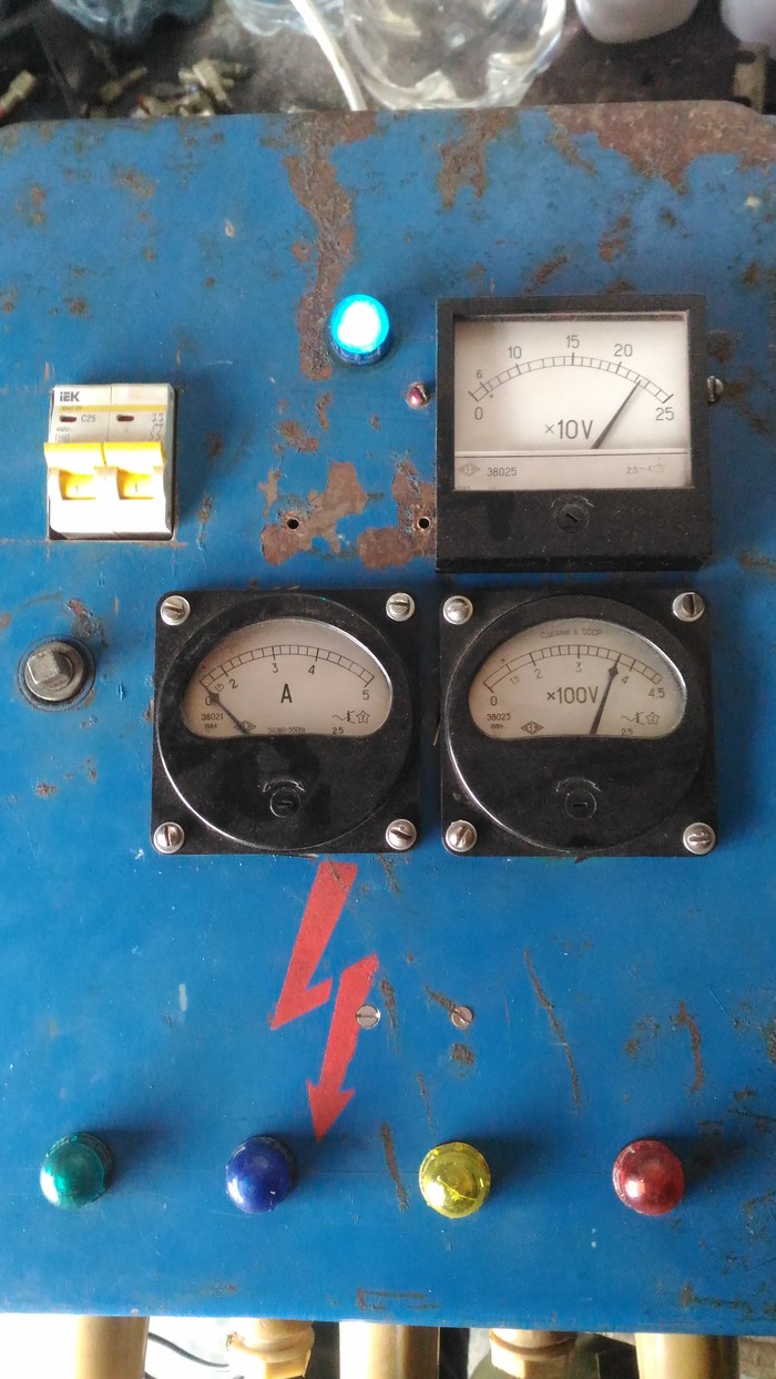 Трансформаторы я смонтировал в подходящем по размеру железном ящике. На переднюю панель вывел вольтметры входного и выходного напряжений, амперметр потребляемого нагрузкой тока и контрольные лампочки. Единственное, в ящик влезло не 10, а только 9 трансформаторов. Недостающее напряжение я добрал, соединив параллельно 6 маломощных обмоток на 18 вольт. Они все вместе по сечению становятся равными силовой.