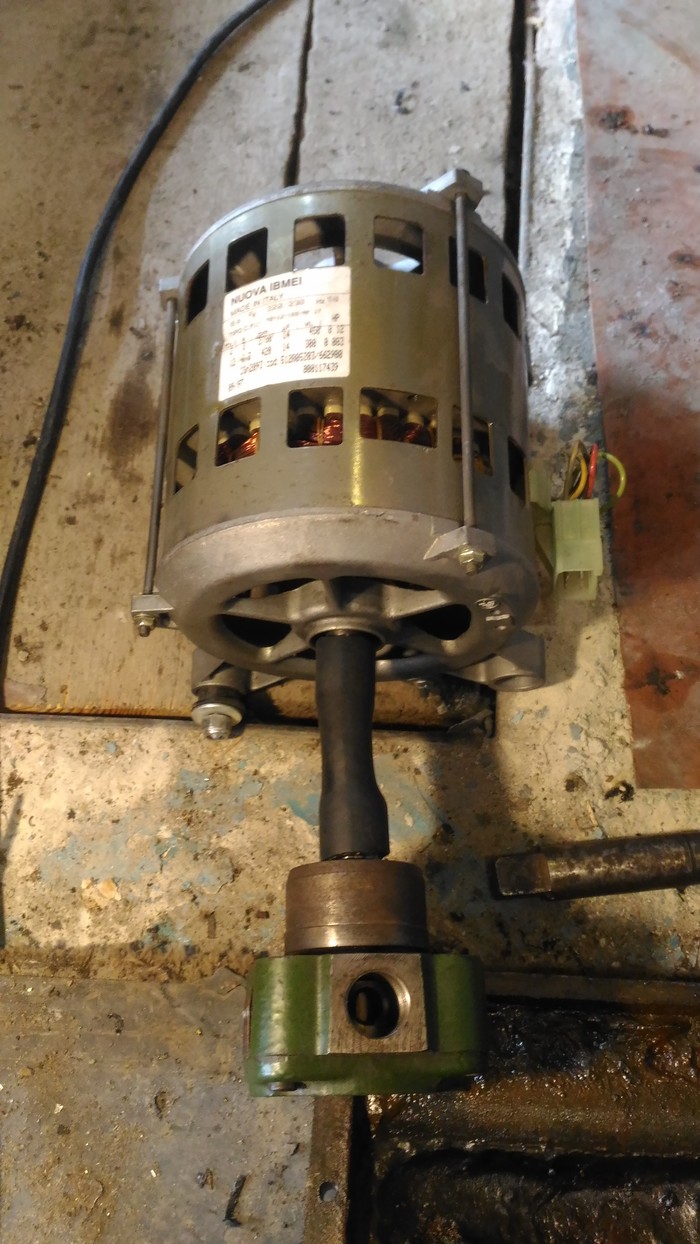 Аналогичным образом можно было бы запитать и помпу маслонасоса, но это нежелательно, поскольку пока помпа не прокачает масло в переднюю бабку, шпиндель будет работать насухую, вызывая при этом повышенный износ редких и дорогих опорных подшипников. Ситуацию усугубляет то, что масло, необходимое для его смазки (индустриальное масло) обладает очень малой вязкостью и практически не задерживается на стенках и не создает масляной пленки. У меня в связи с отсутствием родной маслостанции вообще планируется колхоз с отдельным двигателем от стиралки и пластинчатым насосом, соединенных резиновой муфтой из куска шланга. Вот, кстати, фото.